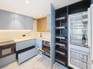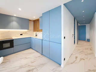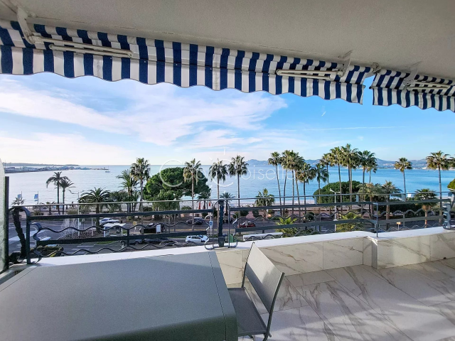 Cannes Croisette Martinez 3 pièces vue mer panoramique Tout près du Martinez, splendide appartement 3 pièces de 78 m2 en étage élevé. Belle vue mer panoramique depuis terrasse Sud de 12 m2. Grand séjour/cuisine US de 30 m2 et magnifique chambre master avec dressing et salle de bain/wc en suite avec vue mer également. Belle chambre secondaire avec salle de douche en suite aussi. Buanderie équipée. Toilette invité. L'ensemble en état neuf avec belle menuiserie portes et placards. Cave et parking inclus. Très beau produit
