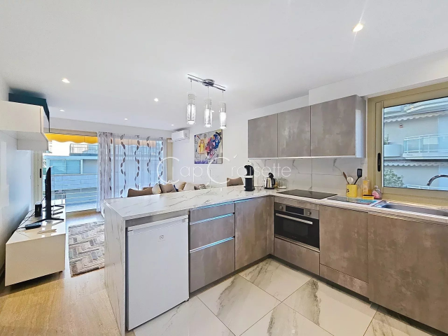 Cannes - Palm Beach 2P Dernier étage Joli aperçu mer A vendre à Cannes - Palm Beach, à deux pas de la Croisette et du Port Canto, un 2 pièces rénové de 38 m2 en dernier étage qui profite d'un joli aperçu mer et du soleil couchant sur la terrasse et séjour. Chambre au calme à l'Est. Idéal pour pied à terre ou locatif.