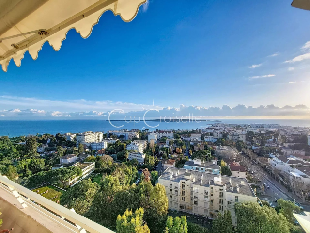 Cannes Basse Californie 3P vue mer panoramique A vendre : Résidence de grand standing et sécurisée tout près des commodités. Superbe 3 pièces de 94 m2 en étage élevé avec splendide vue mer panoramique. Grand séjour (chambre mobile) de 44 m2 sur vaste terrasse double baie de 14 m2. Cuisine séparée - Grande chambre - 2 salles d'eau/WC - Cave - Très grand parking collectif sécurisé.