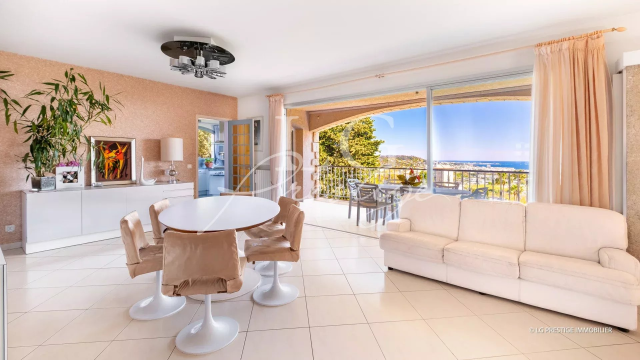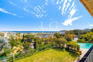 VUE MER PANORAMIQUE Située sur les hauteurs de Mandelieu - A quelques minutes des plages, golfs et des commerces. Quartier résidentiel calme & recherché. Villa de caractère aux beaux volumes de 290 m² offrant une vue dominante exceptionnelle sur la Baie de Cannes jusqu'à Théoule.