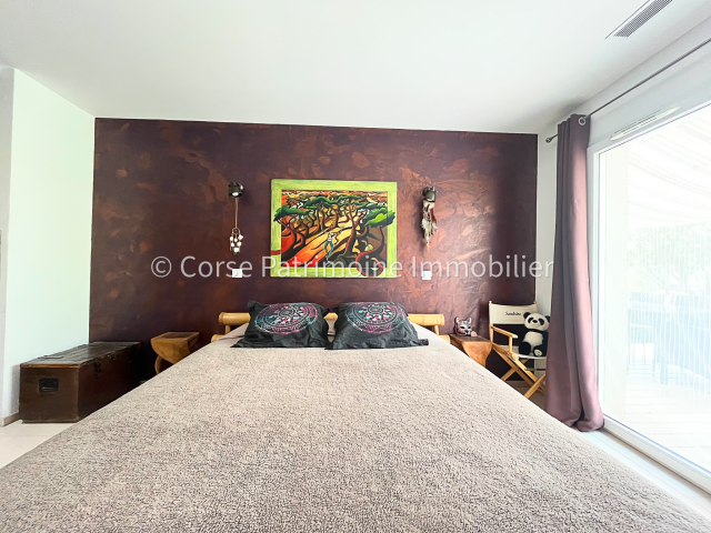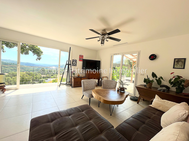 Corse Patrimoine Immobilier vous propose cette maison récente de 2015, située sur une magnifique parcelle arborée de 1406 m2, offrant une vue imprenable sur la mer et les montagnes. Cette demeure spacieuse, s'étendant sur deux niveaux, propose une surface habitable d'environ 127 m2. La maison principale se compose d'une cuisine entièrement équipée, ouverte sur une vaste pièce de vie de 34 m2, dotée d'un insert, créant une ambiance chaleureuse et conviviale. L'espace nuit dispose de 3 chambres, dont deux suites parentales avec salle de douche privative ainsi que d'une salle de douche supplémentaire pour plus de confort. Le niveau inférieur comprend un appartement récent de type 2, comprenant une chambre, une pièce de vie et une salle de douche, idéal pour recevoir des invités ou pour une location indépendante. Un garage d'environ 60 m2 attenant à la bâtisse offre un espace de rangement supplementaire ainsi qu'un carport. L'extérieur de la propriété est tout aussi séduisant avec son terrain arboré et son jacuzzi, parfait pour des moments de détente en plein air. Ne manquez pas cette opportunité unique d'acquérir une maison alliant modernité et confort, dans un cadre exceptionnel. Les informations sur les risques naturels auxquels ce bien est exposé sont disponibles sur le site Géorisques : www.georisques.gouv.fr