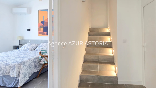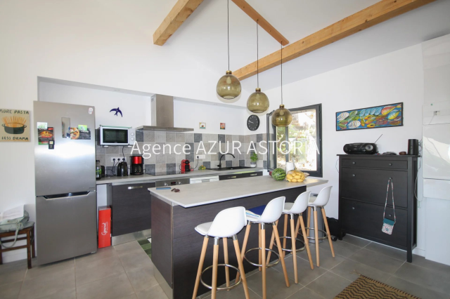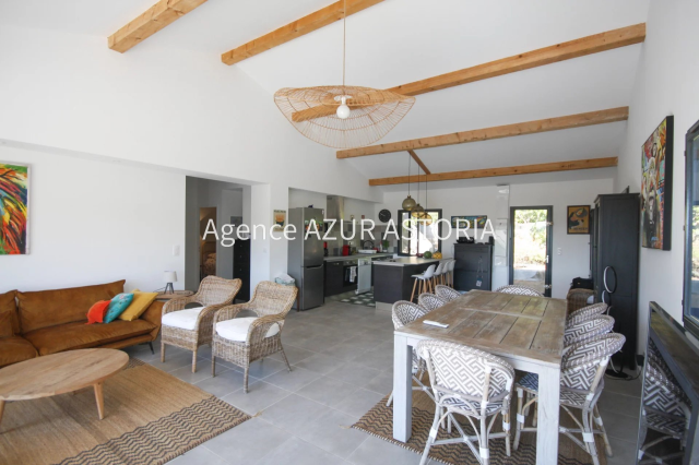 À VENDRE Aux Issambres – Villa 5 pièces avec piscine, rénovée en 2024 – à 500 m de la mer - LES ISSAMBRES, Dans un environnement calme, verdoyant et recherché, à seulement 500 mètres des plages et à 1,6 km des commerces, cette villa rénovée en 2024, climatisée, offre un cadre de vie privilégié entre nature et mer. La maison se compose d’un vaste séjour lumineux, traversant, avec plafond cathédrale, ouvrant sur une terrasse dominante avec vue dégagée sur la verdure et aperçu mer, sans aucun vis-à-vis. La cuisine ouverte entièrement équipée prolonge l’espace à vivre avec convivialité. La villa comprend 3 chambres confortables, 2 salles d’eau, 2 WC, ainsi qu’une chambre indépendante disposant de sa propre salle d’eau et toilettes – idéale pour recevoir ou pour un usage indépendant. Une pièce de rangement de 20 m² complète l’ensemble, apportant un vrai plus en termes de stockage ou d’aménagement. À l’extérieur, vous profiterez d’un espace piscine bordé de terrasses ensoleillées, d’un boulodrome, et d’un terrain sans vis-à-vis de 1360m², le tout dans un calme absolu. Le coup de cœur assuré pour les amoureux de tranquillité, de nature et de vie balnéaire