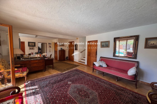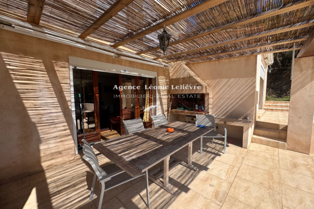 Aux Issambres, à 10 mn à pied des plages et des commerces, dans un secteur calme, sur un terrain de 1645 m², agréable maison de 145 m² comprenant de plain-pied : Une entrée avec WC, un grand espace de vie avec cuisine ouverte équipée et un salon télévision indépendant ouvrent sur une terrasse couverte prolongée par l'espace piscine. Une chambre avec placard donnant sur un solarium, un bureau ou chambre, une petite cuisine et une salle d'eau avec WC. A l'étage, deux chambres dont une avec solarium avec vue mer et une salle de bain complète. Le sous-sol abrite un double garage, une chaufferie et trois caves. La piscine de forme libre avec terrasse vient compléter ce bien.
