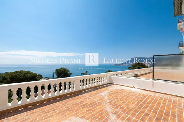 Appartement Bourgeois Vue Mer Panoramique Roquebrune Cap Martin. Dominant le prestigieux Cap Martin, au sein d'une copropriété sécurisée avec parc privé, magnifique et lumineux appartement doté d'une large terrasse offrant une vue mer panoramique. Il dispose de deux chambres, d'une grande salle de bains, d'une cuisine fonctionnelle et d'un spacieux séjour ouvrant sur l'extérieur. Parking collectif et cave. Un garage peut être acquis en sus