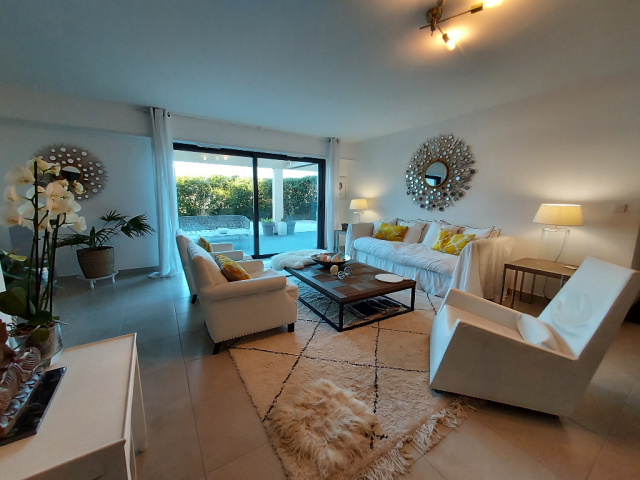 Idéalement bien situé en plein coeur de Porticcio, magnifique appartement d'exception récent de très bon standing avec jardinet et vaste terrasse dans une belle résidence sécurisée à proximité immédiate de la plage et des commerces. Petite vue mer depuis son jardin. Ce bien se compose d'une une agréable pièce de vie avec accès direct sur une vaste terrasse de 40m² et jardinet de 60m², une cuisine US équipée avec cellier, un coin nuit comprenant 3 chambres dont une suite parentale et une petite chambre d'appoint, 2 wc, 2 salle d'eau, dressing, box fermé 1 place de parking complète ce bien. charges annuelles avec chauffage et climatisation 3200 euros par an - Foncier 1250 euros environ