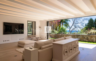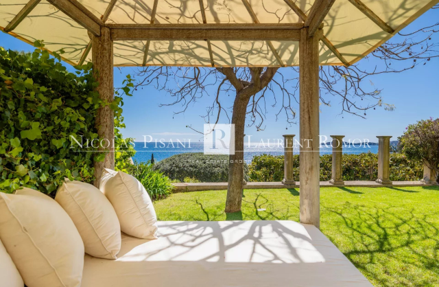 Belle piscine avec cuisine d'été, salon extérieur, jardin le tout face à la mer.