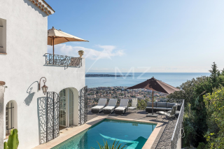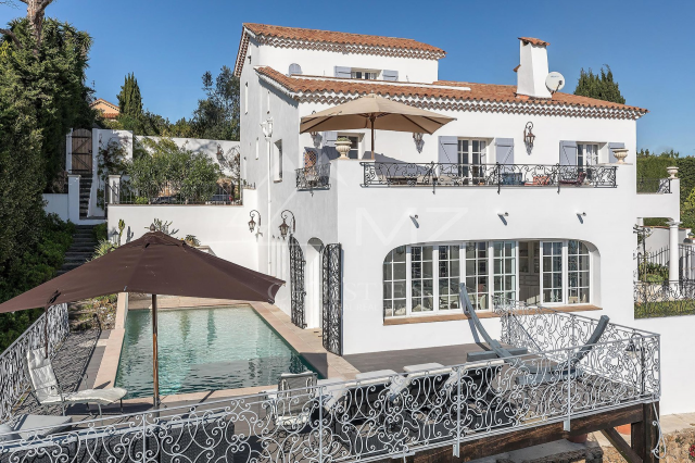 Proche Cannes - Vue mer époustouflante Située dans un quartier recherché en position dominante, jouissant d'une vue panoramique sur la mer, la ville et la montagne, cette villa rénovée exposée sud et au calme absolu offre une entrée avec séjour, salle à manger et cuisine ouvrant sur une grande terrasse, deux chambres et une salle de douche. A l'étage, une belle chambre de maître ensuite avec dressing et terrasse. En rez-de-jardin, une deuxième salle de réception avec cuisine et salle a manger, deux chambres, un bureau et une salle de douche. Terrain d'environ 700 m2 avec piscine. Nombreuses places de parkings et double entrée.