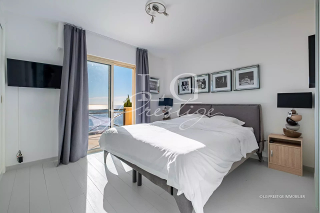 VUE PANORAMIQUE MER À MANDELIEU – à seulement 8 km de CANNES Votre agence LG Prestige Immobilier à Mandelieu-La Napoule vous propose cette superbe villa contemporaine offrant une vue mer panoramique exceptionnelle, idéalement située dans le quartier résidentiel recherché des Termes. Entièrement rénovée, cette villa d’environ 118 m², exposée Sud-Est, se compose d’une entrée, d’un séjour lumineux avec cuisine équipée ouverte sur la salle à manger, de trois chambres, chacune avec sa salle d’eau privative, ainsi que de belles terrasses dominant un jardin paysager de 990 m². Stationnements pour plusieurs véhicules complètent ce bien.
