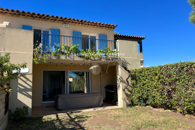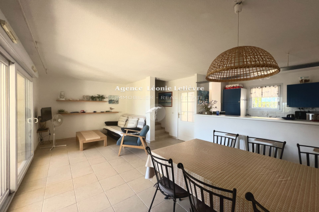 Proche mer, dans une résidence avec piscine, agréable mazet en duplex et mitoyen des deux côtés. Il comprend une entrée avec toilettes, une cuisine séparée équipée avec passe-plat. Le séjour / salle à manger donne sur une terrasse couverte prolongée par un jardinet d'environ 50 m². À l'étage, deux belles chambres avec grand placard, avec accès à une terrasse qui bénéficie d'une vue dégagée et d'un petit aperçu mer, une salle de bains et un WC séparé. Deux places de parking.